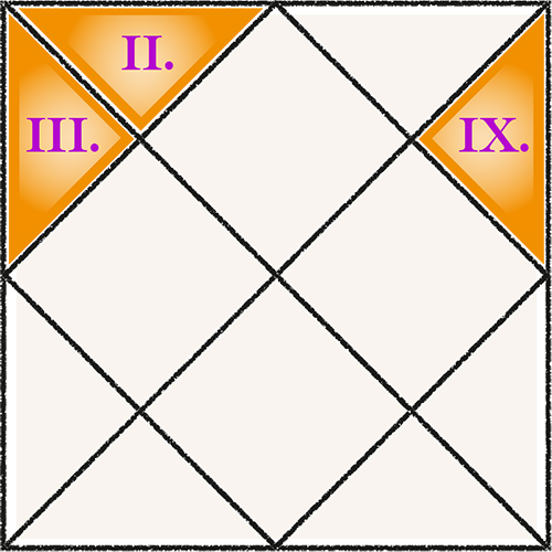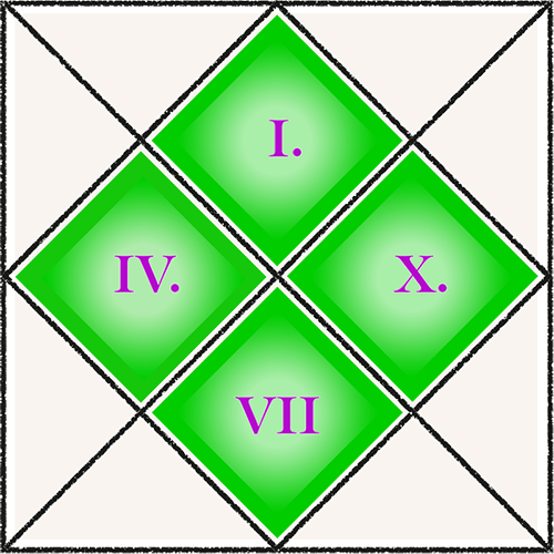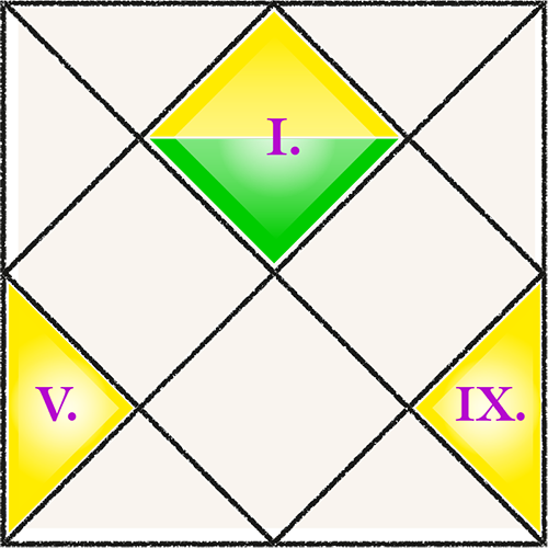 Die überragende Rolle des I. Hauses wird neben seinen elementaren Themenfeldern bereits hier auch strukturell herausgestellt, weil es nicht nur Grundmatrix und Schaltzentrale der Persönlichkeit ist, sondern auch die Belegung der restlichen Häuser durch die Zeichen/Drehbücher unumkehrbar festlegt! Die drei Glückshäuser beschreiben die drei Formen des eigenen Wachstums und Glücks – beginnend mit dem Hauptgewinn der eigenen Geburt (I.) und damit dem aktuellen Glück oder der Glücksbasis, das bereits verdiente Glück aus der Vergangenheit (V.) sowie das Potential des zukünftigen, in diesem Leben erreichbaren Glücks (IX.)